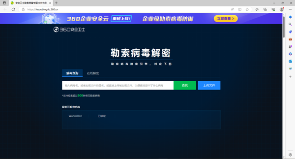 2、360安全卫士会自动跳转到浏览器中,我们在该界面将被勒索的文件名后缀或直接上传被加密的文件,即可查询到是什么木马病毒造成的。