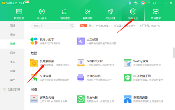 1、打开360安全卫士,在【功能大全】页面点击【反勒索服务】。
