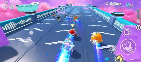 蛋仔派对音速冲刺通关攻略。在得到加速音符过后,摇杆往左躲避第一个障碍后再回到中间赛道吃一个加速音符之后,一直靠右前进就可以了。