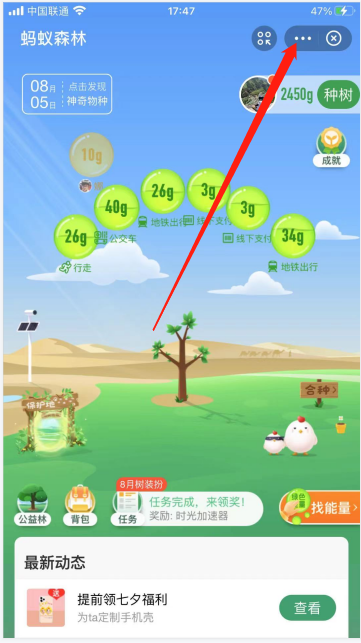 3.?进入到蚂蚁森林界面后,点击右上角的三个小黑点。