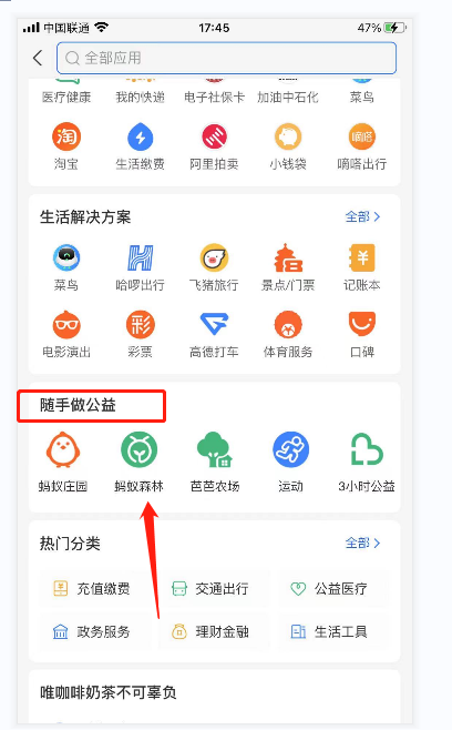 2.?随后往下滑,在随手做公益里面找到蚂蚁森林,然后点击它。