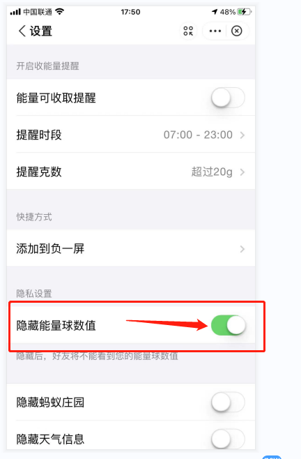 5.?进入到设置的界面后,会看到下方在隐私设置里,有一个隐藏能量球数值,然后点击打开开关即可。