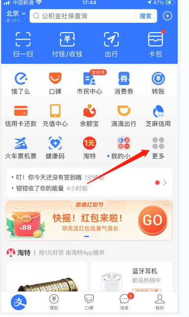 1.?打开支付宝,进入到主界面后,点击更多图标。