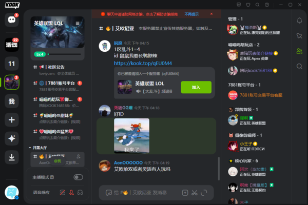 这款软件是当今国内游戏语言行业刚刚杀出的一匹黑马,小编个人最喜欢用的就是它,它内置了各种游戏的服务器,比如小编喜欢英雄联盟,就可以申请加入英雄联盟服务器,像是当下火热的无畏契约、云顶之奕等,在这里都有,KOOK庞大的用户量决定了每个服务器中的活跃人数都非常多,我们可以在这里找到一起玩游戏的伙伴,在线语音开黑,还可以自主创建服务器,打造自己管理的空间。