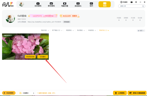 自己制作的电脑主题保存成功后,回到元气桌面软件的主界面中,进入到【我的】→【我制作的】界面中,找到刚刚制作好的电脑主题效果,然后点击【设为壁纸】按钮,将它设置为系统效果即可。
