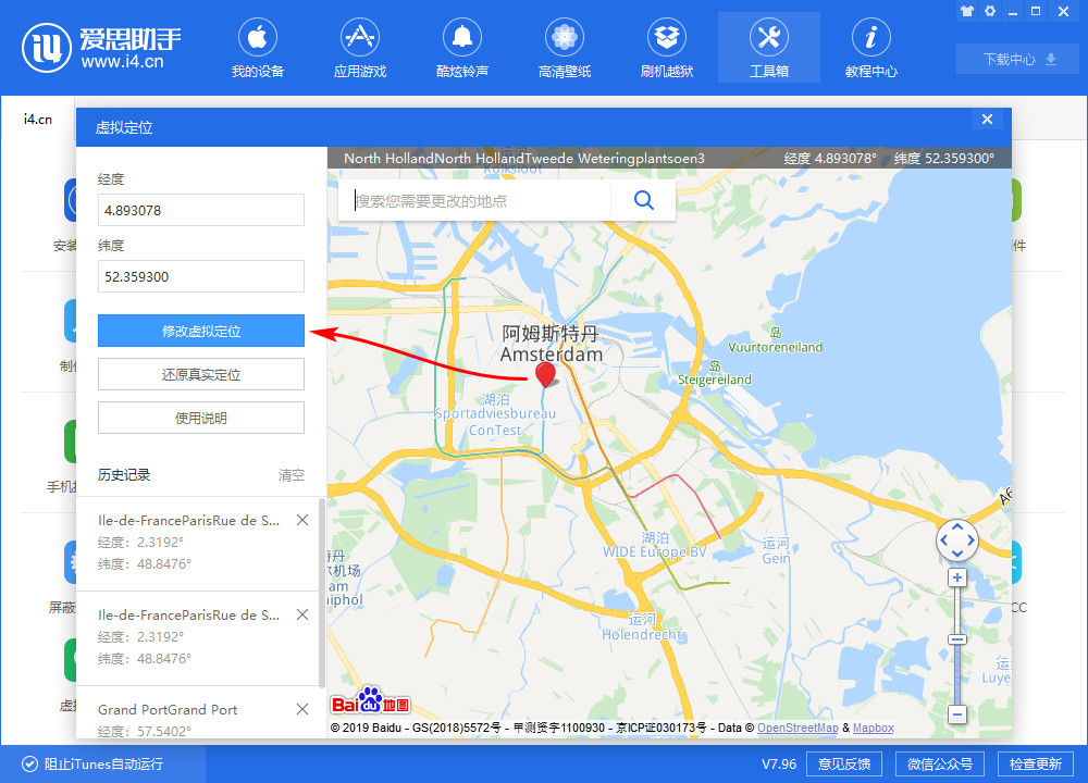 3.打开后,在地图搜索框内直接搜索需要定位的地名,然后点击“修改虚拟定位”按钮即可。