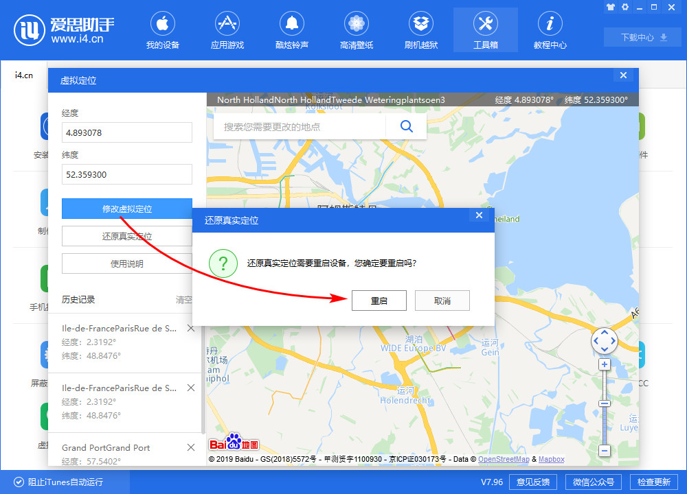 6、如需恢复正常定位,可以在爱思助手上点击“还原真实定位”按钮并“重启”设备;