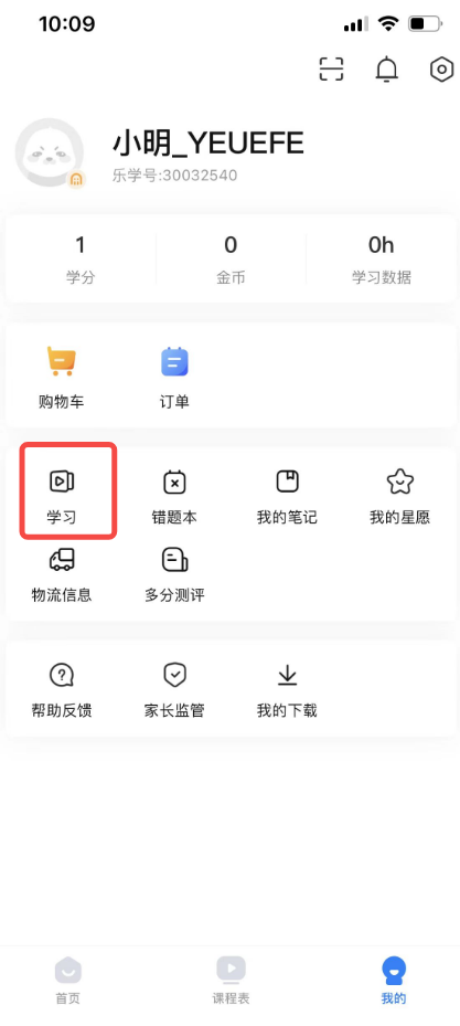 二、进入“我的”页面后,点击页面中间左侧“学习”按钮。