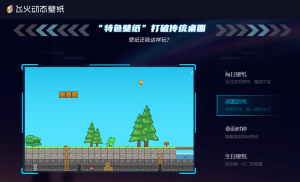 2、飞火动态壁纸。看到软件名,相信大家都知道这软件是拥有动态壁纸的,其中动态游戏壁纸有很多,酷炫的、养眼的,可谓是应有尽有。另外,飞火动态壁纸还能实现“将游戏置于壁纸中”,我们在桌面上也可以玩一些小游戏,或是进行互动。
