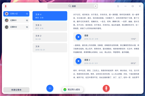 更新:支持新数据导入、搜索优化、文字转语音优化、笔记本列表交互优化、界面布局进行优化。