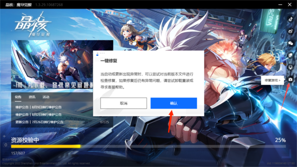 一、启动游戏,点击右侧的【小药箱】修复游戏按钮。接着点击【确认】按钮。最后,等待游戏修复完成,一般就可以解决问题了。