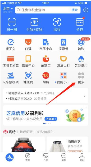 1.?首先打开支付宝,进入到主界面,会看到下方有一个更多,然后点击它。