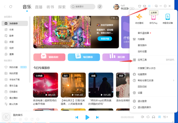 1、启动电脑端的酷狗音乐,点击界面顶部右上角的【三】主菜单图标,接着选择【应用工具】选项。