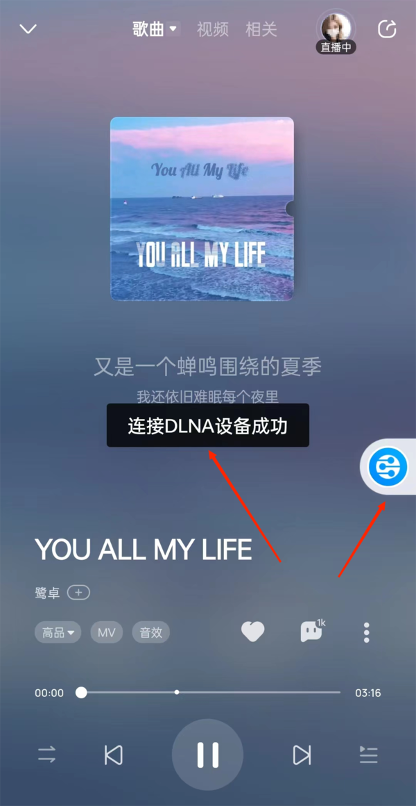 7、接着,手机上会弹出【连接DLNA设备成功】的提示,并且在界面右侧会显示该功能的图标,此时播放歌曲。
