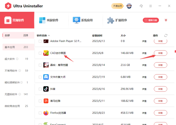 6、然后在常规软件界面中,找到想要卸载的软件,点击其右侧的【卸载】按钮。