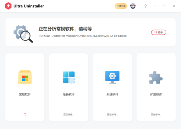 4、UltraUninstaller工具安装好以后会直接启动,并对电脑系统中已安装好的软件程序进行扫描,扫描需要一定的时间,耐心等待扫描完成。