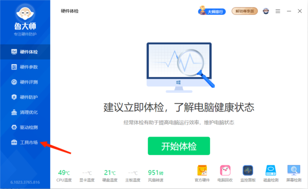 1、启动电脑端的鲁大师软件,然后点击左侧列表中的【工具市场】功能。