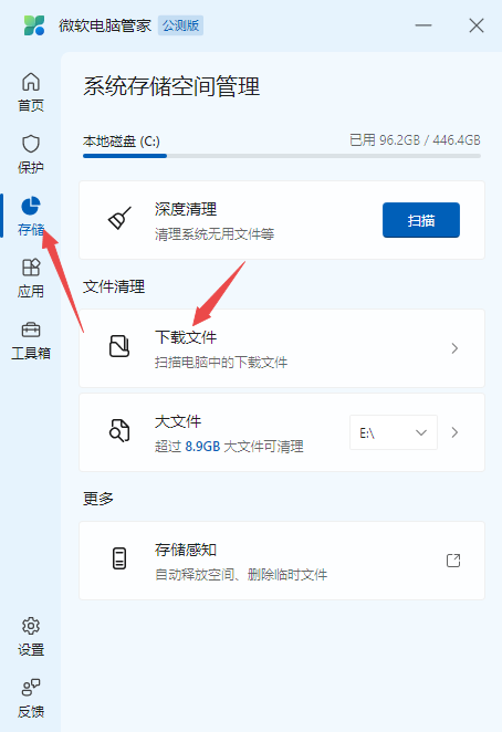第一步,进入到微软电脑管家的【存储】选项中,然后点击【下载文件】功能。