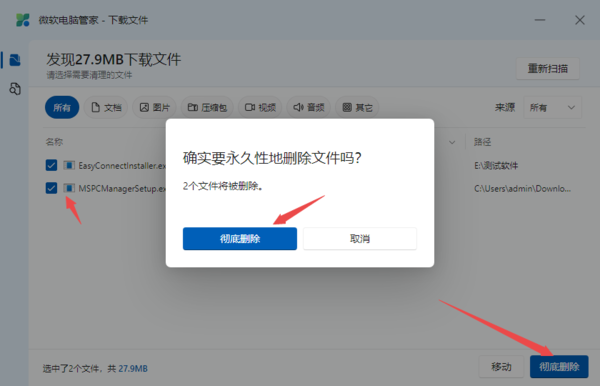 第二步,接着,软件就会开始扫描下载文件的内容了,在扫描出来的结果中,勾选要清理的下载文件,然后点击右下角的【彻底删除】按钮,最后再弹出的窗口中再次点击【彻底删除】按钮即可。