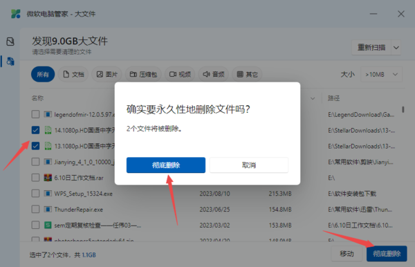 第六步,最后,在扫描的结果中,勾选想要清理的大文件,点击界面右下角的【彻底删除】按钮,最后再点击弹窗中的【彻底删除】按钮即可。
