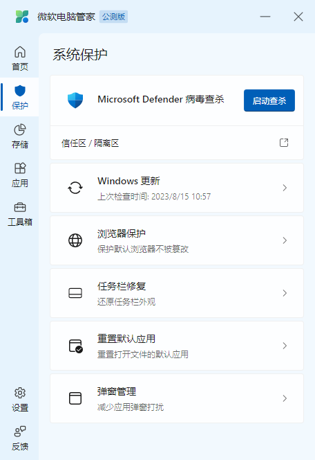 第一步,启动电脑端的微软电脑管家,然后点击软件界面左侧列表中的【存储】选项。