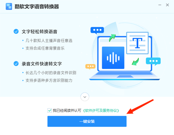 1、双击下载好的酷软文字语音转换器安装包,然后直接点击【一键安装】按钮。