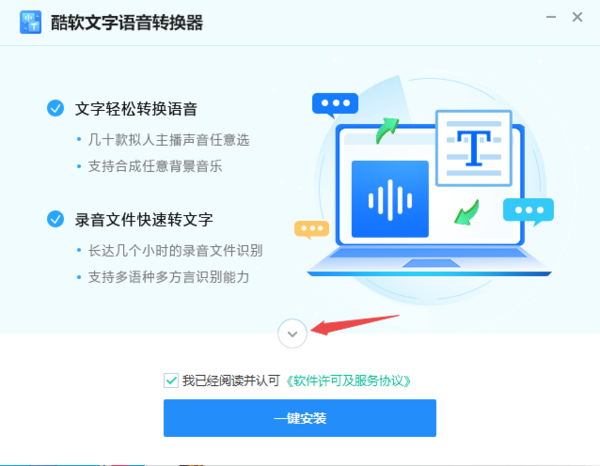 1、启动酷软文字语音转换器的安装包,然后点击安装界面中的【向下的小箭头】。