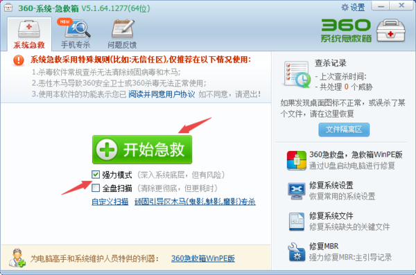 二、然后,如果之前有下载过外挂或私服工具的话,去360急救箱的官网下载360系统急救箱软件,软件安装好以后,勾选强力模式然后点击开始急救按钮,待扫描完成后重启电脑,然后在进行强力扫描并重启电脑,一般也是可以解决问题的。