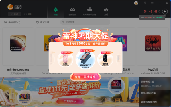 根据查找到的资料来看,2023暑假玩游戏用雷神加速器比较好一点,因为目前雷神加速器拥有暑期优惠活动,168元就能够畅享6000小时的加速时长,之前小编也已经为大家介绍过了,而且软件可以随时对游戏加速进行暂停,使得游戏加速时长利用的更加充分。