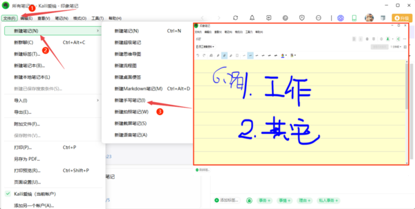 大家只需要启动电脑端的印象笔记软件,然后点击【文件】→【新建笔记】→【新建手写笔记】,就可以开始记录你的手写笔记内容了。