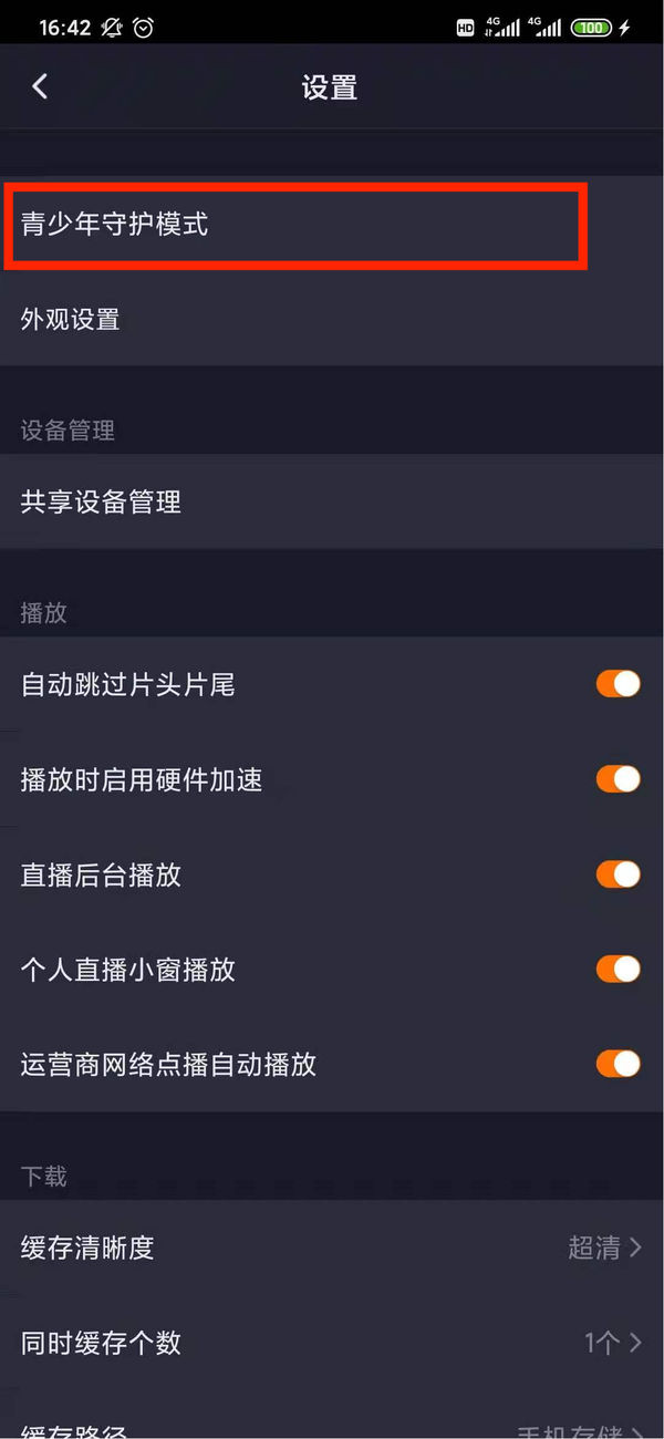 第三步,进入软件设置界面后,选择最上方的【青少年守护模式】;