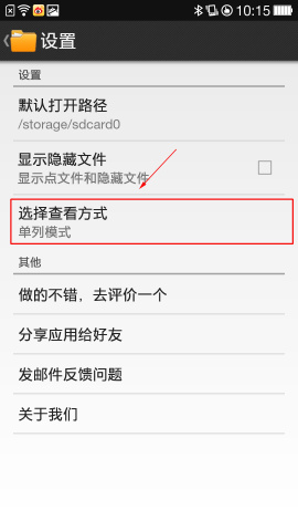 打开手机文件管理软件,在软件界面点击手机“菜单键”进入“设置”,在“设置界面”点击“选择查看方式”。(如下图所示)
