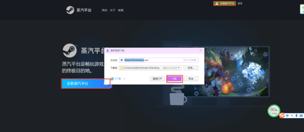第一步,在电脑的浏览器中输入蒸汽平台,然后找到官网并点击进入。接着在官网界面中,点击界面右上角的【安装蒸汽平台】按钮,然后进行蒸汽平台软件的下载和安装。
