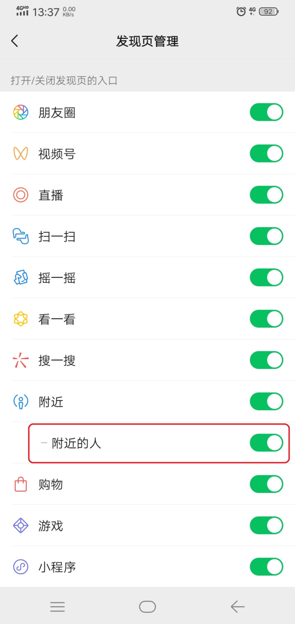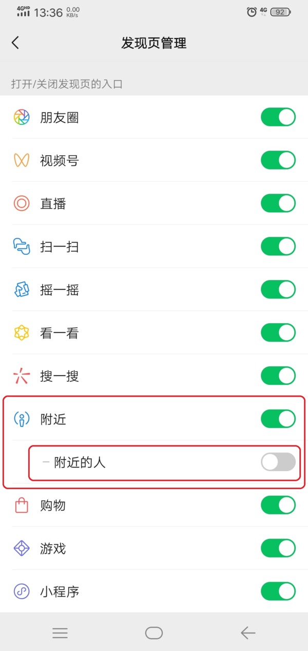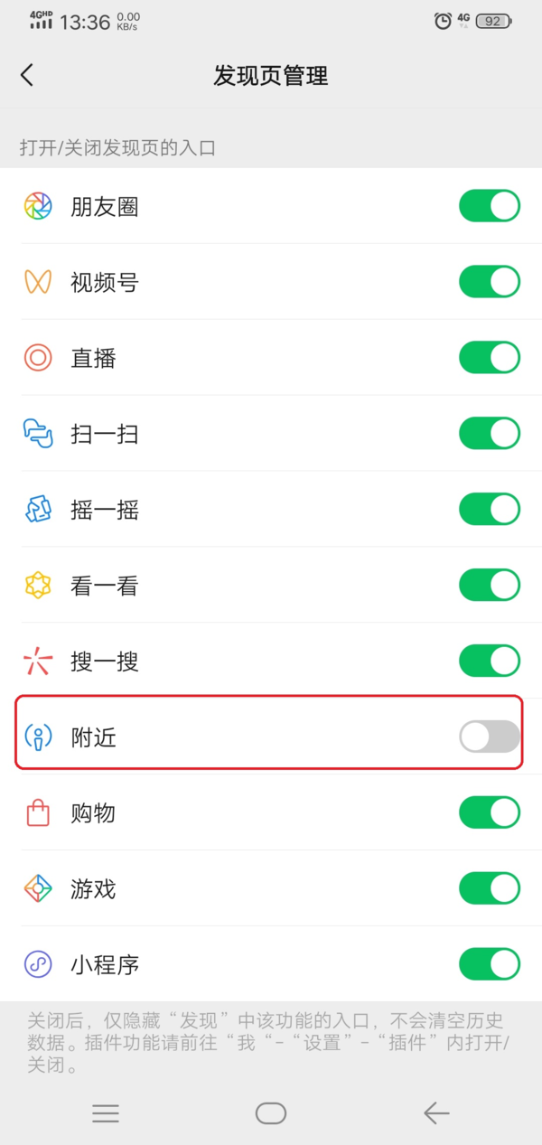 第五步,进入到发现页管理界面后,我们可以看到,自己微信账号的【附近】功能是关闭的状态,此时我们将该功能滑动打开。