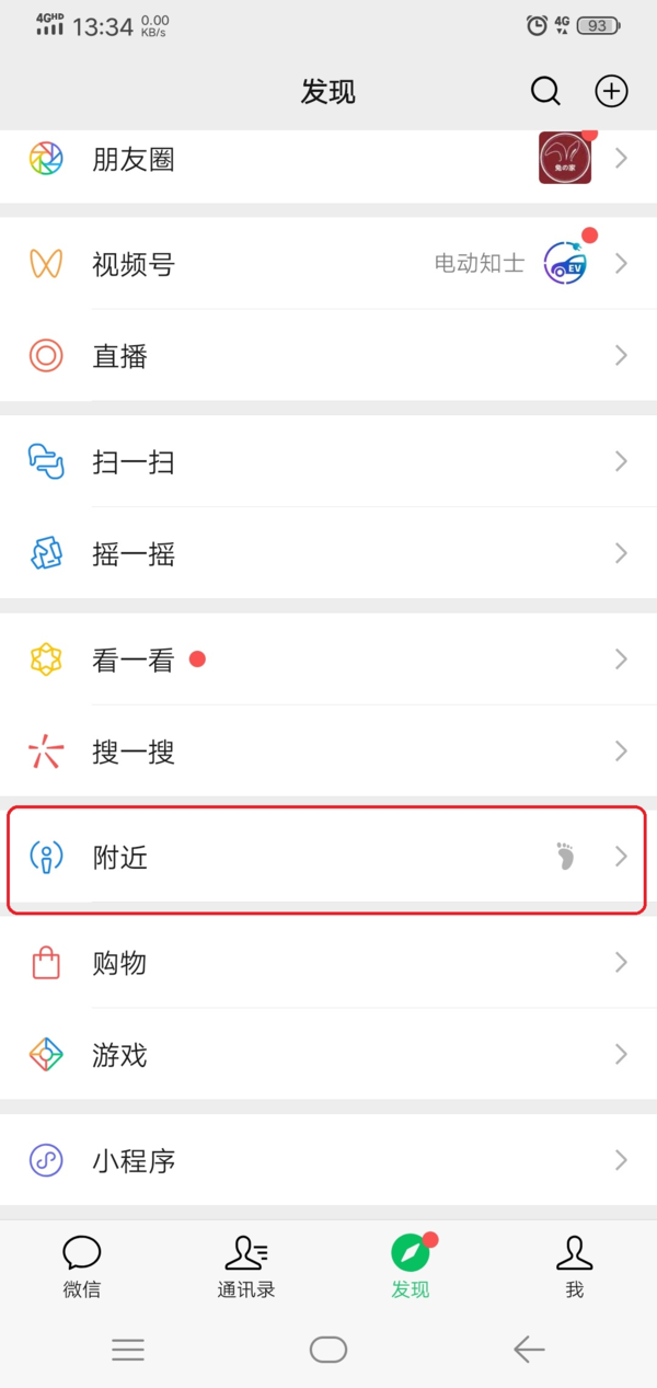 第七步,附近和附近的人功能全部打开好以后,回到微信的【发现】页面当中,我们便可以看到【附近】功能了,并且在你开启了附近的人功能后,该功能的右侧会有一个小脚丫的图标。