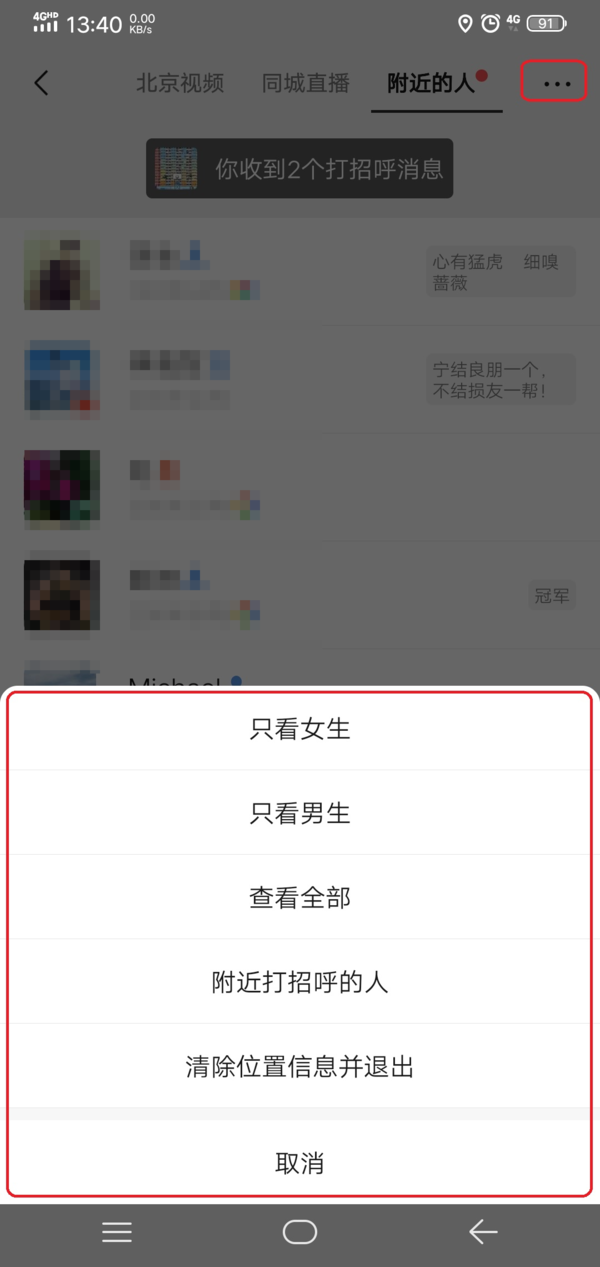 第十步,而点击附近的人页面右上角的【…】三个点图标,我们还可以根据自己的需求,来选择附近的人是【只看女生】、【只看男生】、【查看全部】、【附近打招呼的人】,在或者是【清除位置信息并退出】该功能了。