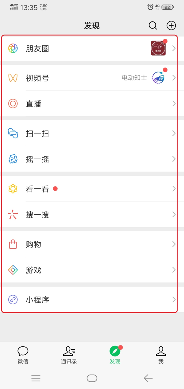 而在微信的发现页面中,我们还可以看到【摇一摇】、【看一看】、【搜一搜】这样的非常好玩的功能,同时还有【附近】、【购物】、【游戏】等功能,功能挺多的,而有了这些功能,我们日常微信的使用也可以变得非常的有趣。