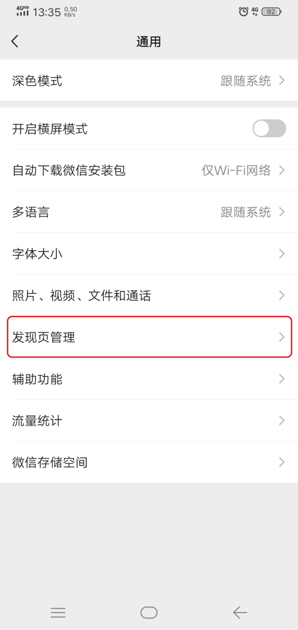 第四步,进入到通用界面后,再找到【发现页管理】选项,并点击进入。