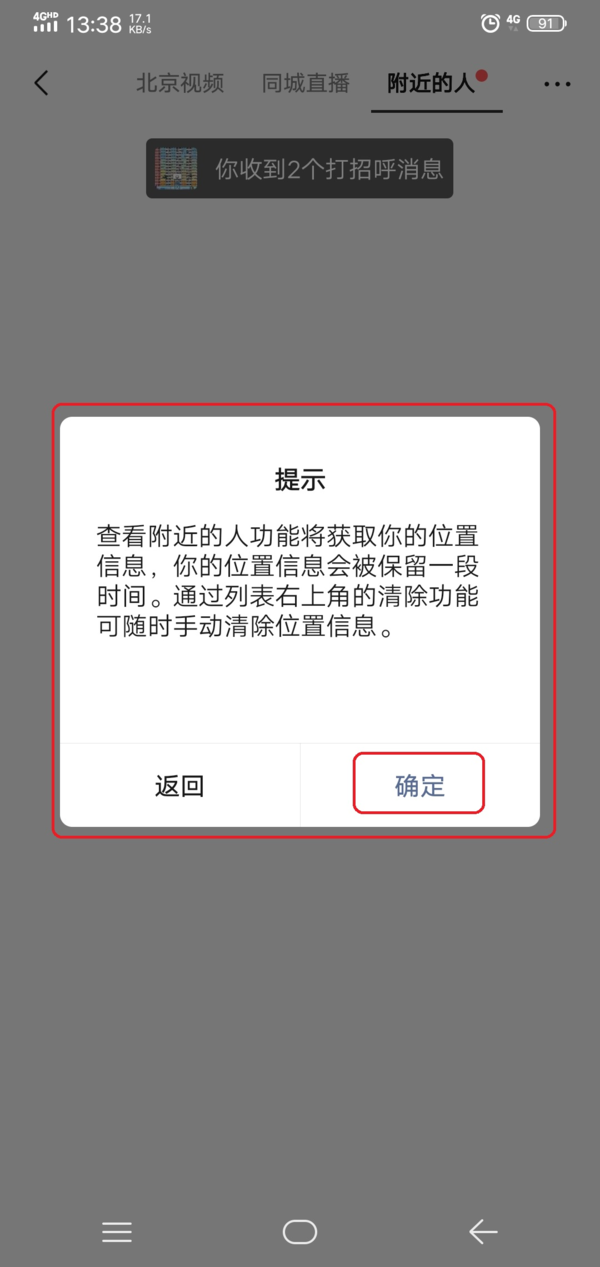 第八步,点击【附近】功能,然后软件就会跳转到【附近的人】界面当中了,并弹出一个提示窗口,点击【确定】按钮。