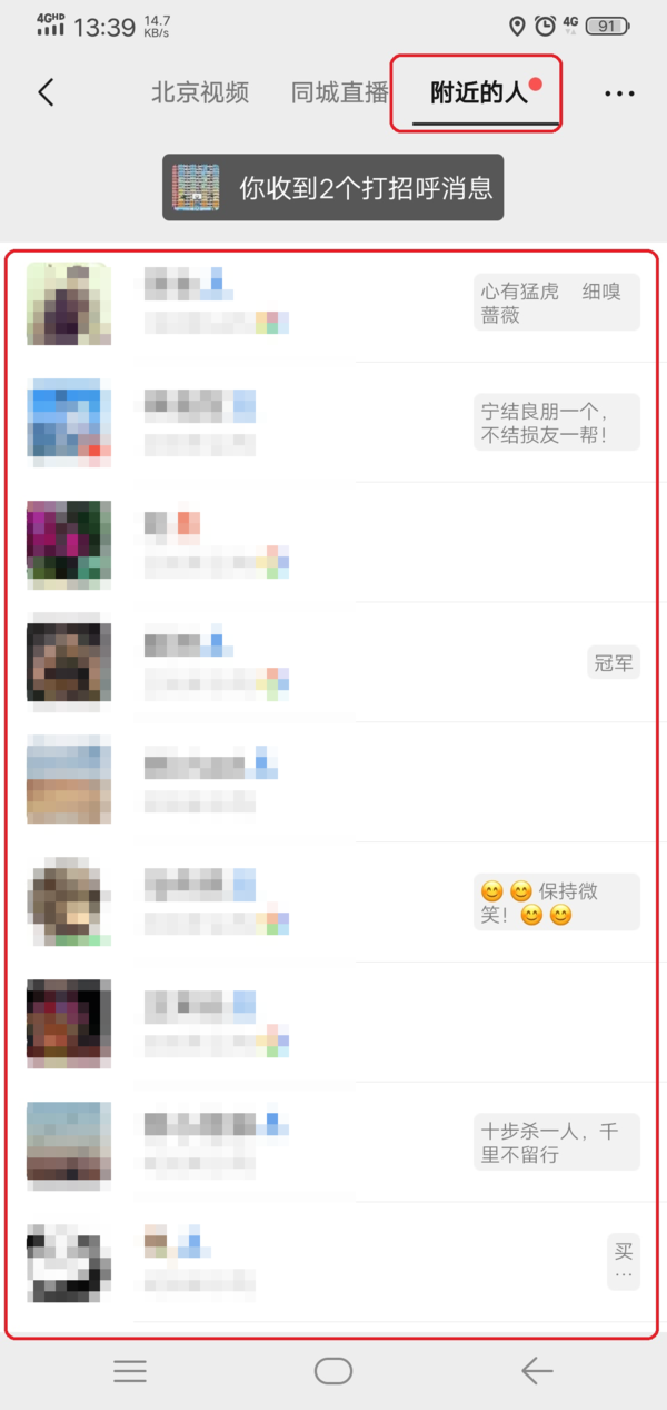 第九步,然后微信就会帮我们搜索出附近的人了,我们就可以和附近的小伙伴打招呼了。