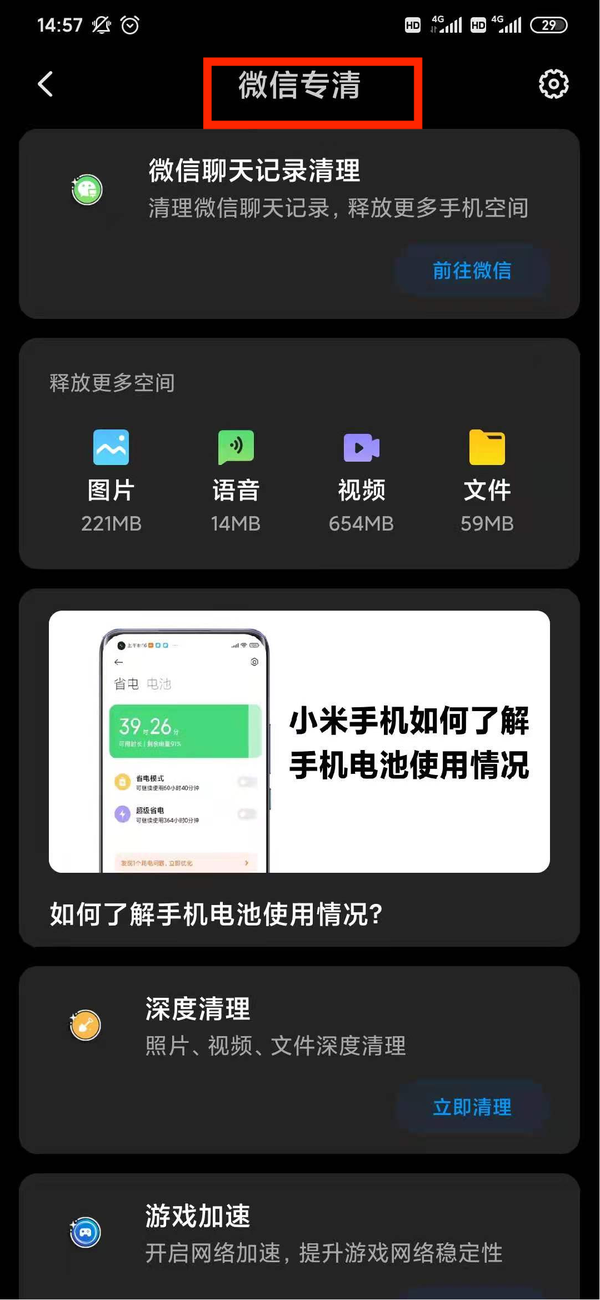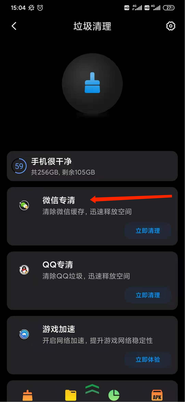 5、当手机内存或者SD卡存储空间都已经被占满了,空间不足也可能会造成闪退,我们可以去清理一下存储空间,做一些微信专清,大文件专清等工作释放一部分空间即可;