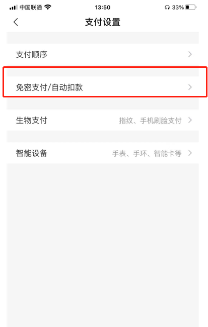 4.?进入到支付设置界面后,点击免密支付、自动扣款即可。