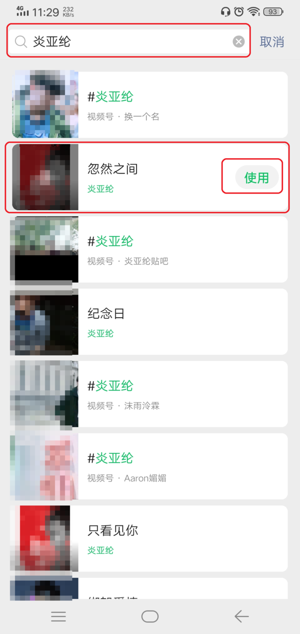 第七步,当然了,如果界面中没有直接看到自己喜欢的歌曲,还可以搜索自己喜欢的歌曲或歌手,找到歌曲后,点击歌曲,然后再点击歌曲右侧的【使用】按钮。