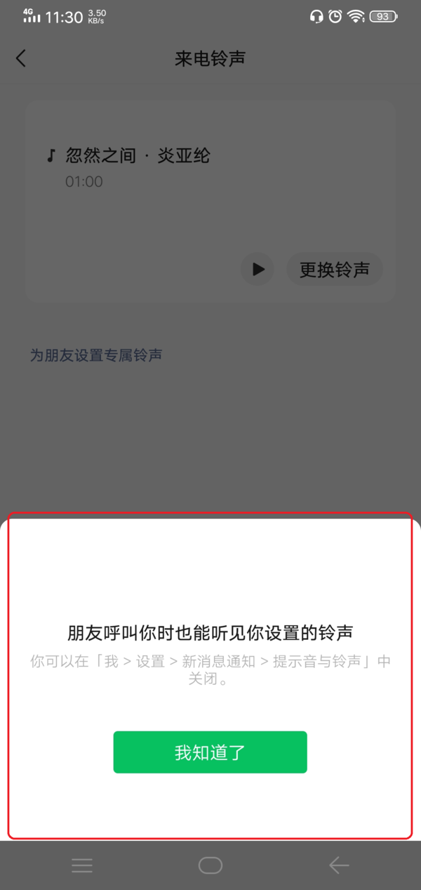 第八步,回到来电铃声设置界面后,此时会弹出一个提醒,就是朋友在使用微信通过语音或视频通话呼叫你的时候,也能够听见你设置的铃声,当然这个功能也是可以通过设置关闭的。