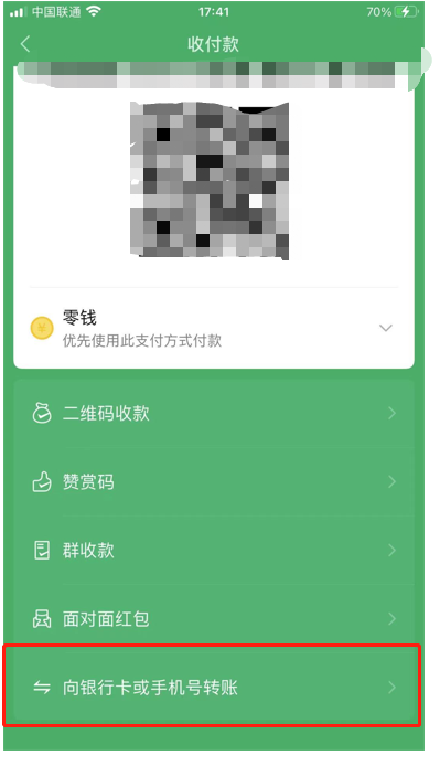 4.?进入到收付款的界面后,往下滑,就会看到有一个向银行卡或手机转账的字样,然后点击它。
