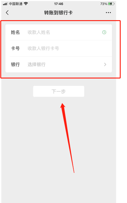 6.?这时会进入到转账到银行卡的界面,然后,输入对方的姓名跟卡号,以及选择银行,最后点击下一步即可。