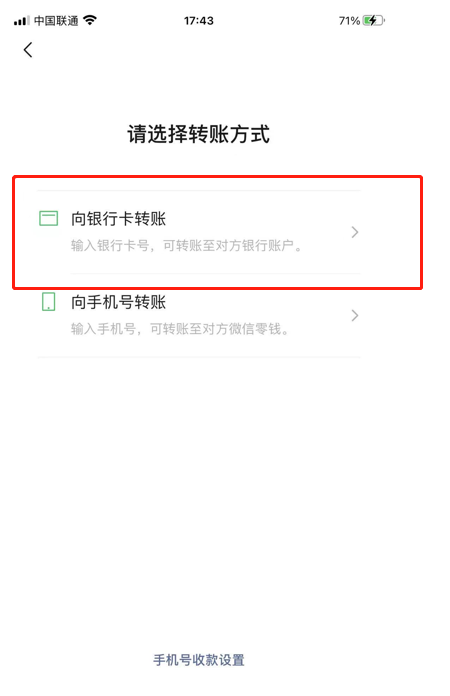 5.?然后就会进入到,请选择转账方式的界面,然后点击向银行卡转账。