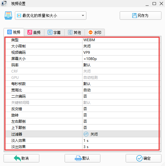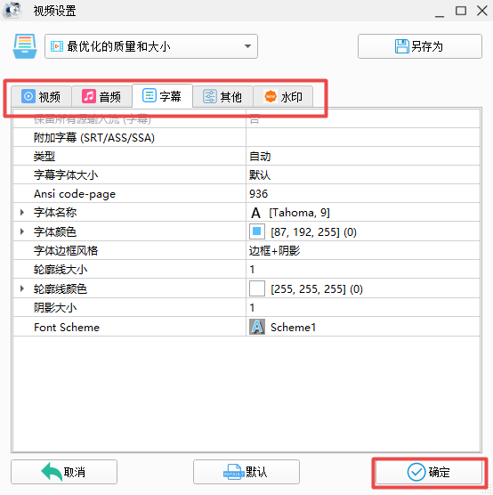 第五步,紧接着软件就会弹出视频设置的窗口了,在此窗口中,我们可以设置视频的大小限制、二次编码、淡入淡出等参数,还可以对视频中的音频、字幕等参数进行设置。全部设置好以后,点击【确定】按钮。
