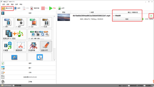第八步,然后软件就会开始对视频的格式进行转换了,待转换完成后,【输出/转换状态】一栏就会显示【完成】。点击文件最右侧的【绿色三角】按钮,就可以播放转换后的视频了。而点击软件界面顶部左上角的【输出文件夹】按钮,即可对转换后的视频文件进行预览查看了。