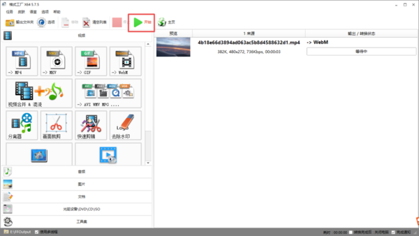 第七步,回到格式工厂的主界面当中后,我们就可以开始视频格式的转化工作了,点击界面顶部的【开始】按钮。